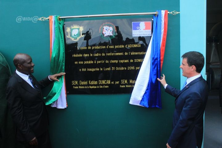 Les Premiers ministres ivoirien et français, Daniel Kablan Duncan et Manuel Valls ont inauguré, lundi, une usine de production d’eau potable à Adonkoi (Anyama) dans la périphérie nord d’Abidjan, augmentant ainsi la capacité d’alimentation en eau de la capitale économique ivoirienne de 5000m3/J, notamment pour les secteurs d’Abobo N’Dotré, Anyama et Songon.