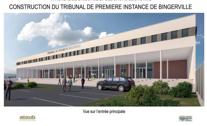 Financé par la France à hauteur de 5 383 380 062 FCFA, le Tribunal de Première Instance de Bingerville sera un bâtiment R+2 qui comprendra entre autre: 4 salles d’audiences publiques de 100 à 200 places, plusieurs salles d’audiences de cabinet, une salle des pas perdus de 494 m2...