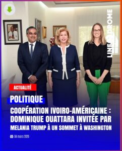 La Première dame de Côte d’Ivoire, Dominique Ouattara, participera les 24 et 25 mars 2026 à Washington, aux États-Unis, à un Sommet international consacré aux droits de l’enfant organisé à l’initiative de la Première dame américaine, Melania Trump. L’annonce a été faite mardi 3 mars à Abidjan-Cocody lors d’une audience accordée par la Première dame ivoirienne au chargé d’affaires de l’ambassade des États-Unis en Côte d’Ivoire, Junaid Munir, accompagné de Jenny Bah, première secrétaire de la section politique et économique.