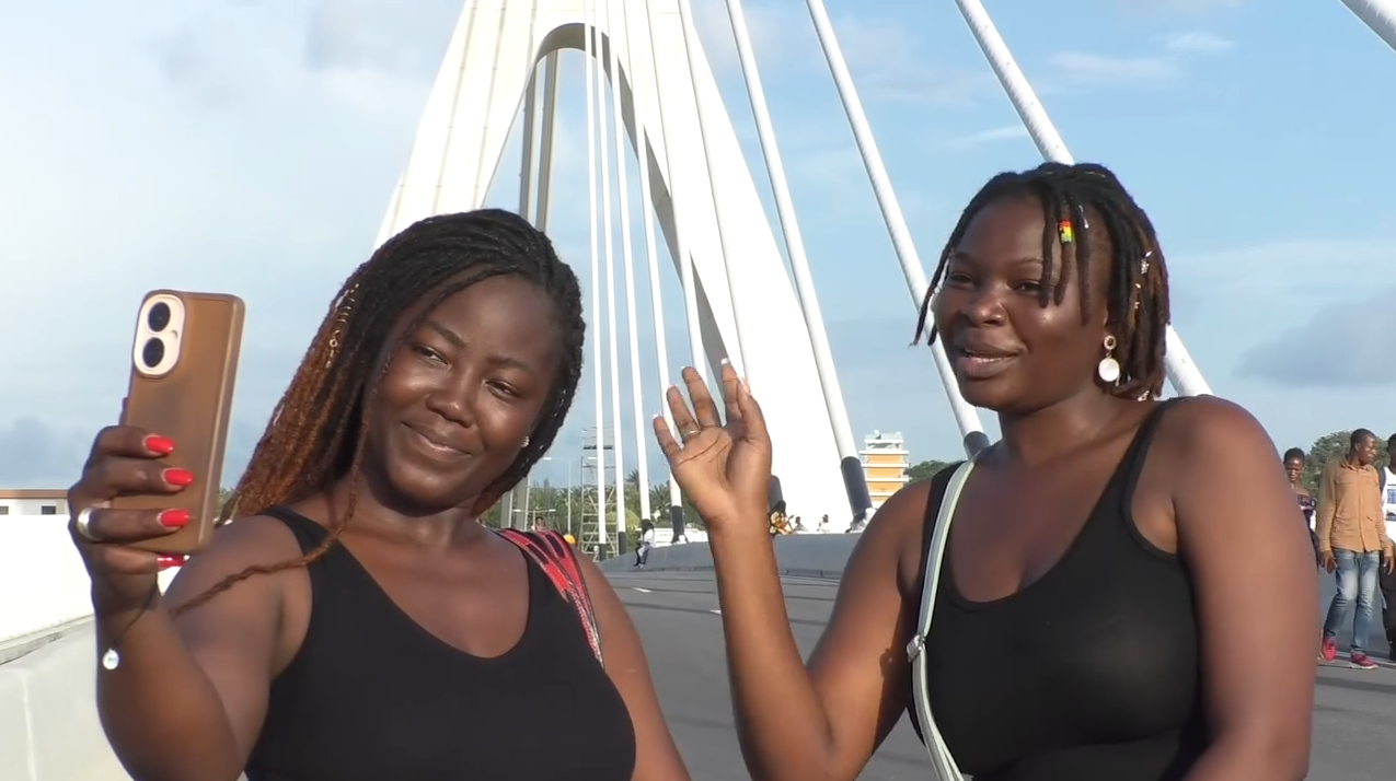 Des visiteurs venus de différentes communes d'Abidjan et de la sous-région dont des enfants, des personnes adultes et des vieillards visitent le pont Alassane Ouattara fermé à la circulation ce 1ᵉʳ novembre 2023. (Deux jeunes filles burkinabé en visite à Abidjan font des selfies).