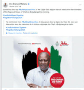 Pour vérifier cette déclaration, nous avons utilisé deux moteurs de recherche : Google Lens et Search by Image. Grâce à la capture d’écran de cette affiche représentant le président ghanéen, ces outils nous ont permis de retrouver la publication authentique ainsi que son contexte. Il s’agit d’une affiche électorale présentant le candidat John Dramani Mahama à l’élection présidentielle ghanéenne du 2 février 2024 sortie de son contexte. Ci-dessous l’affiche originale relayée sur Instagram et le compte X du candidat du NDC