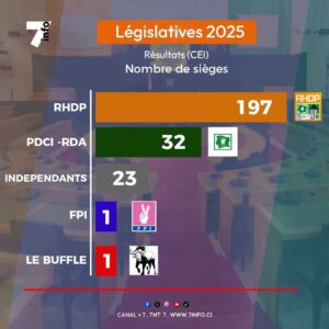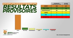 Le parti présidentiel ivoirien, qui se positionne, à l’issue de ces élections, comme le parti majoritaire de Côte d’Ivoire, enregistre ainsi une progression d’une trentaine de sièges par rapport à la législature précédente.