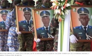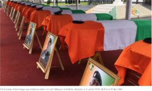 Hommage national, le 2 juillet 2020, à Abidjan, aux 14 soldats tués lors de l’assaut de leur poste-frontière par des combattants jihadistes, à Kafolo, le 10 juin 2020.© AFP-TV