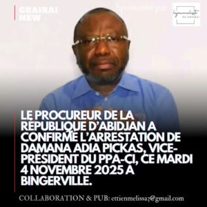 Dans un communiqué du Procureur de la république en date de 04 novembre 2025, toute la lumière ainsi que les raisons de l’interpellation de Damana Adia Pickas, Vice-Président du Parti des Peuples Africains Côte d’Ivoire (PPA-CI) sont faites.
