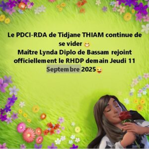 Linda Diplo a conclu son intervention en réaffirmant sa détermination à militer activement pour son nouveau parti.« Je me sens investie d’une mission : servir aux côtés de mes frères et sœurs du RHDP, à Grand-Bassam et partout en Côte d’Ivoire, pour assurer la victoire du candidat du RHDP lors des prochaines échéances. », a conclu l’ex départementale du PDCI à Grand-Bassam.
